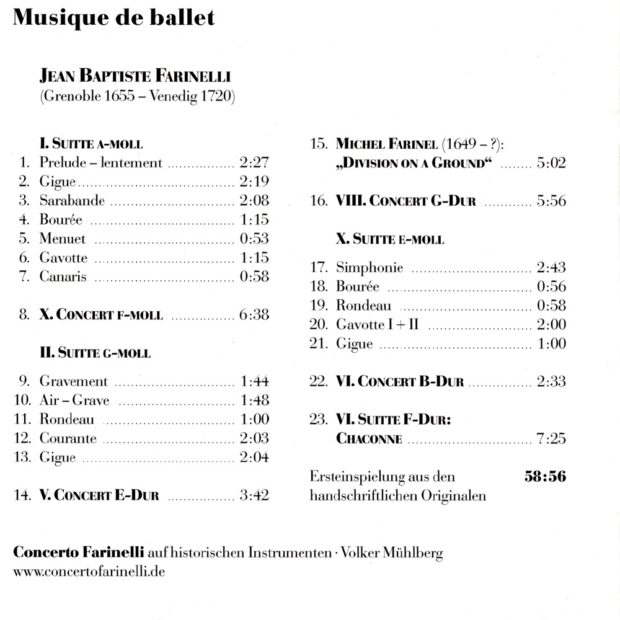 Drei Ballettsuiten des hannoverschen Capellmeisters Jean Baptiste Farinelli (1655-1720) zeigen seine höchst originelle Aneignung französischer Tanzcharaktere, während drei „Grands Concerts“ ein Unikum der Musikgeschichte darstellen: Jeweils einsätzig angelegt und aus kontrastierenden Abschnitten bestehend haben sie einen individuell sehr klar definierten Affektgehalt von tombeauhaftem Trauergestus bis zu galanter Spielfreude. Ergänzt wird diese Aufnahme von einer „Division“ des Bruders Michel Farinel (1649 – ?) – einer Frühform der La-Follia-Variationen.